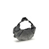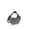 The Grab-D Shoulder Bag by Diesel features a ruched silhouette made of black-wash denim embellished with reflective crystals that add a luminous touch. The belt handle with a hair clip is the distinctive detail that adds personality to the design. The drawstring end is decorated with the resin Oval D logo, while the adjustable belt-style shoulder strap ensures comfort and versatility. The zipper closure completes a practical and characterful bag.