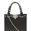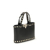 The Mini Shopping Rockstud by Valentino Garavani is crafted from grained calfskin and can be worn on the shoulder, cross-body, or carried by hand thanks to its handles and removable chain. It is adorned with studs and metal parts in a platinum finish and features a hook closure. The nappa lining and interior with two card slots complete this versatile and refined bag.