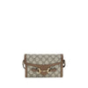 Gucci’s Horsebit mini 1955 Shoulder Bag combines elegance and sustainability thanks to the beige and ebony GG Supreme fabric, made from materials with reduced environmental impact. Enhanced with brown leather trim and gold-tone details, it features a moiré and microfiber lining with a suede effect that enhances its sophistication. The famous Morsetto detail embellishes the design, complemented by a practical shoulder strap and magnetic closure for a functional and classy accessory.